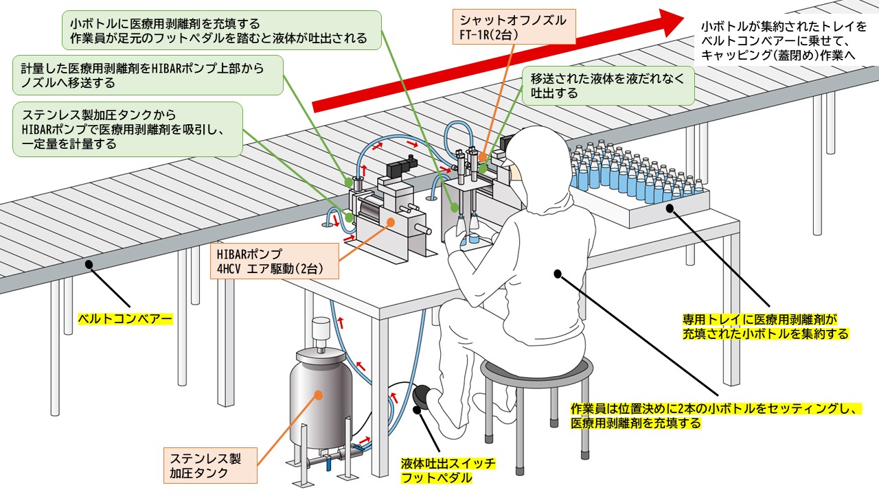 作業効率を上げるため、2つのハイバーポンプを設置し、2本のボトルに同時に充填できるようにしました。作業員は、フットペダルを踏むだけで充填開始信号が入り、シャットオフノズル(FT-1R)を通して2本のボトルに薬液が充填されます。ボトルは専用の位置決めテーブルに正確にセットすることができ、充填後のボトルは作業員が専用トレイに集約し、次のキャップを閉める工程に進みます。